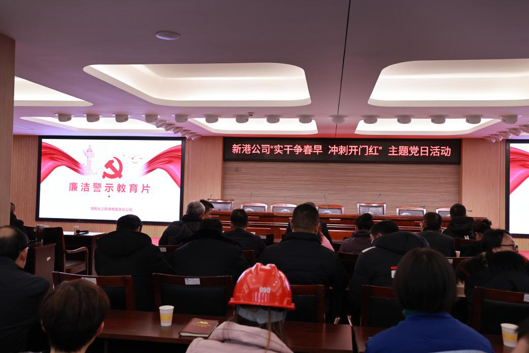 實干爭春早 沖刺開門紅 中共湖南長沙新港有限責任公司委員會主題黨日活動 為扎實擔當起學習宣傳貫徹黨的二十大精神排頭兵的光榮使命,教育引導廣大黨員干部從黨的二十大專題學習汲取精神力量,在新的一年里,進一步堅定理想信念,主動肩負時代重任,開啟新征程。2月17日上午,長沙交通集團新港公司開展學習貫徹黨的二十大精神“實干爭春早,沖刺開門紅”主題黨日活動,此次活動,以“微影片、微黨課、微實事、黨員教育培訓”等多種形式推動黨的二十大精神落地見效。公司黨委副書記、董事、總經理辛華作宣講,班子成員、公司中層管理人員、各支部黨員共76人參加活動。 深學悟初心-【微影片】 全體黨員干部集中觀看2022年度湖南反腐警示片《忠誠與背叛》。通過觀看警示教育片,引導黨員上好廉潔教育“新年第一課”,教育全司廣大黨員干部面對誘惑要保持清醒的頭腦,自覺抵制各種腐敗現象的侵蝕,牢固樹立正確的人生觀、利益觀和權力觀,干干凈凈做事,老老實實做人。  篤行求實效-【微黨課】 學理論之思,踐初心之行。新港公司以“實干爭春早,沖刺開門紅”為主題,從七個黨支部里的推選黨員干部帶頭講,鼓勵黨員人人上臺講【微黨課】,突出“微”這個形式,聚焦“黨”這個靈魂,利用“課”這個載體,教育廣大黨員從不同層面、不同角度深刻領會黨的理論創新成果,以新思想、新觀念、新思路、新舉措,開創公司高質量發展新局面。