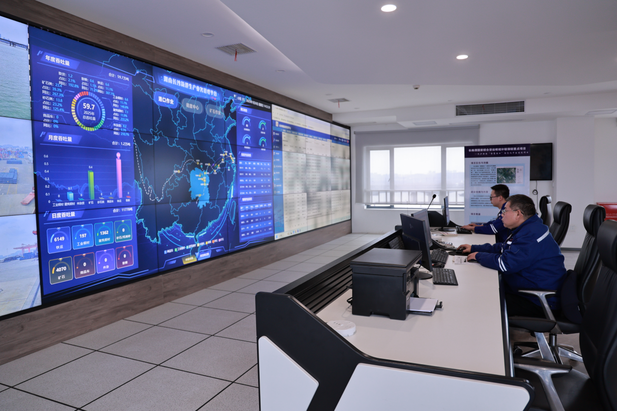 2025年1月28日除夕夜,湖南省城陵磯港口集團長沙新港碼頭燈火通明,機聲轟鳴,一派繁忙景象,長沙新港公司黨委委員、副總經理鄭美洲來到港區開展春節慰問活動,為堅守崗位的職工送上誠摯的感謝和溫暖,并致以節日的問候和新年美好的祝福。 “今年除夕,生產任務依舊繁重,調度中心要多關注生產作業情況”。鄭美洲叮囑到。在5樓智能調度中心監控視頻里,總能看到一個個熟悉的身影穿梭在港區各作業面:北片區4號倉庫正在緊張有序的作業著,碼頭前方滿載庫利塊的船舶正在5號吊機下開始卸貨,長沙新港專用鐵路線上停放著75節車廂,等待裝車發運,一切如同往日。唯一不同的是辦公樓墻面上懸掛的“福”字和中國結,在夜色的襯托下,渲染了春節的喜慶氛圍。