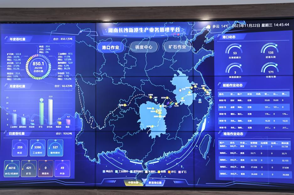 二、創(chuàng)新賦能:智慧綠色雙引擎驅(qū)動升級 數(shù)字化轉(zhuǎn)型是長沙新港三年變革的鮮明注腳。2023年,長沙新港智控調(diào)度中心和生產(chǎn)業(yè)務(wù)管理平臺全面上線,實現(xiàn)船舶動態(tài)監(jiān)測、港口實時監(jiān)控等智能化管理;2024年,“電永磁鐵吊具”等設(shè)備投產(chǎn),有效提升裝卸效率,降低人力成本;2025年,依托信息化平臺構(gòu)建“數(shù)字港+多式聯(lián)運”模式,提高貨物周轉(zhuǎn)效率,縮短客戶報港、提貨流程。
