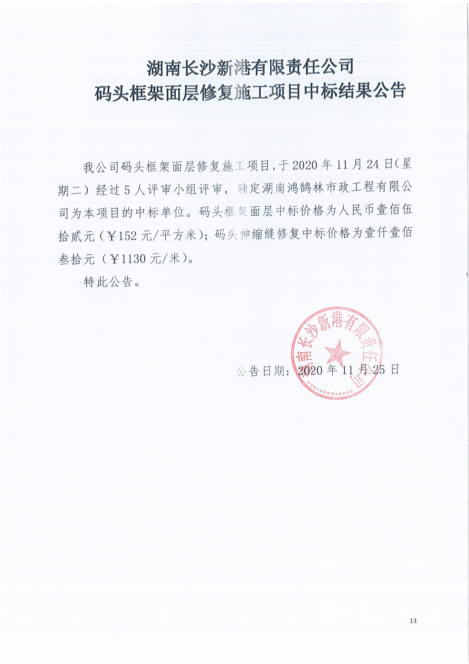 湖南長沙新港有限責任公司碼頭框架面層修復施工項目中標結果公告