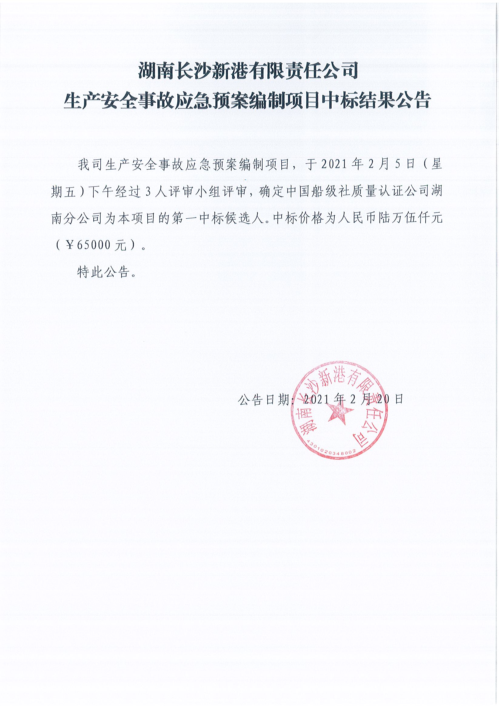 湖南長沙新港有限責任公司生產安全事故應急預案編制項目中標結果公告