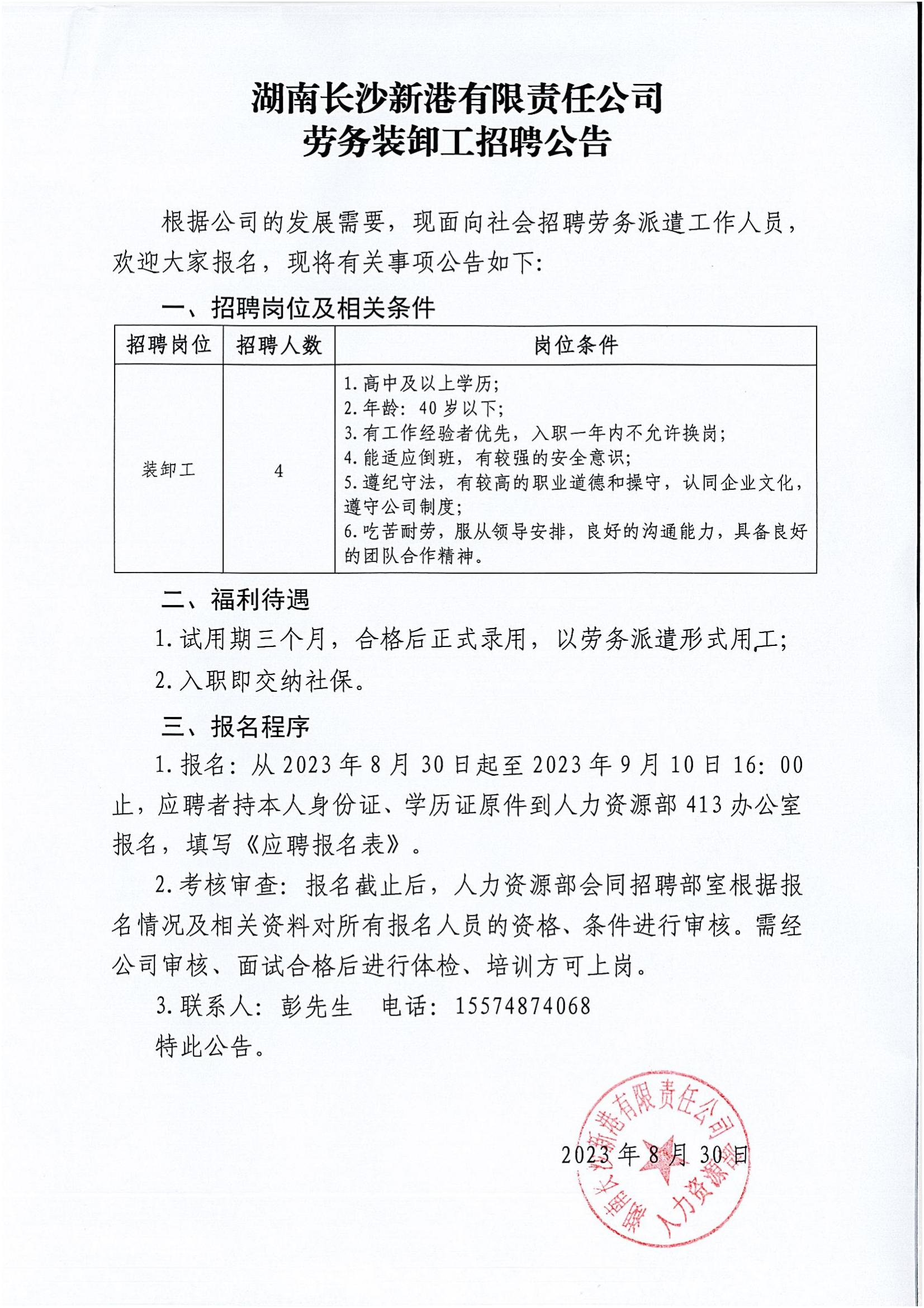湖南長沙新港有限責任公司勞務裝卸工招聘公告