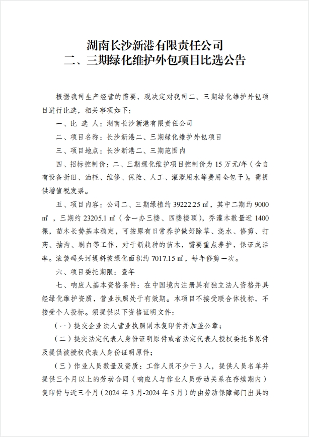 湖南長沙新港有限責(zé)任公司二、三期綠化維護(hù)外包項目比選公告